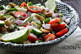 Combine everything together in a bowl and toss well. Taste, and adjust with more salt, spices, or lime juice as needed. Chill the kachumber until you are ready to eat it. Makes approximately 5 or 6 small servings. Enjoy!